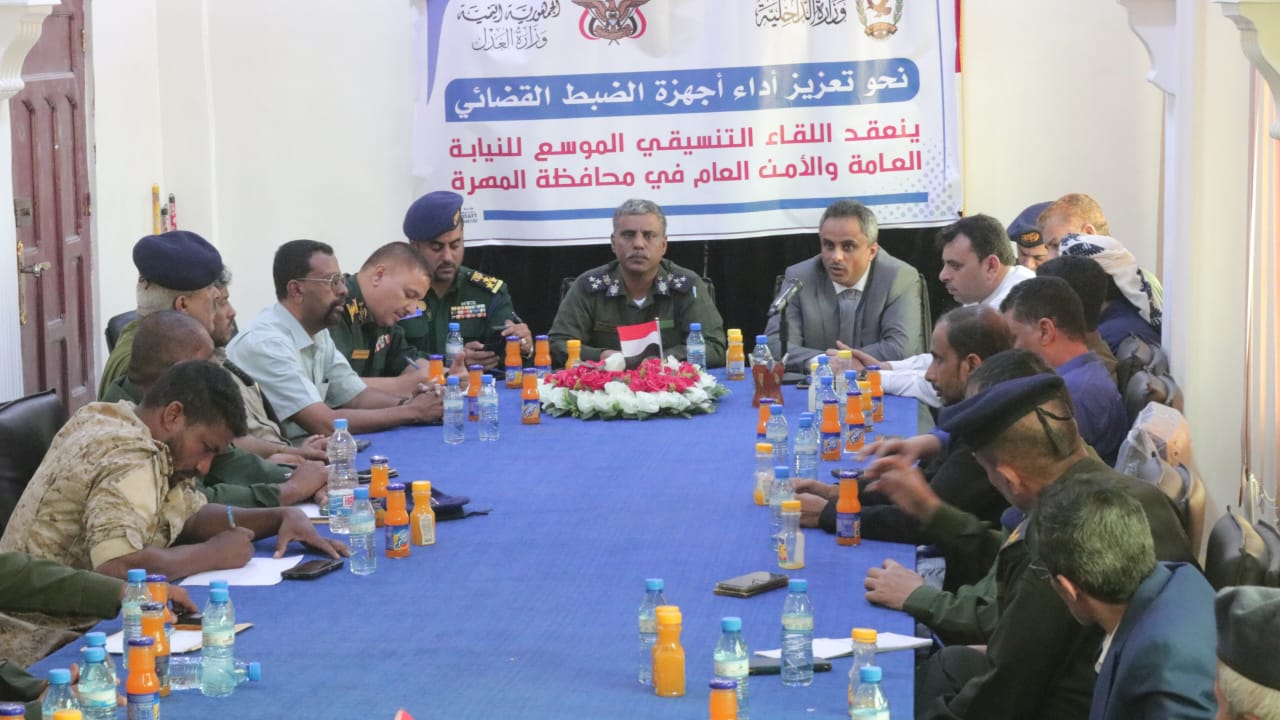 تحت شعار نحو تعزيز أداء أجهزة الضبط القضائي أنعقد اللقاء التنسيقي الموسع للنيابة العامة والأمن العام في محافظة المهرة صباح اليوم الأثنين لمناقشة عدد من القضايا الأمنية والتنسيق بين الأجهزة الأمنية والقضائية ..