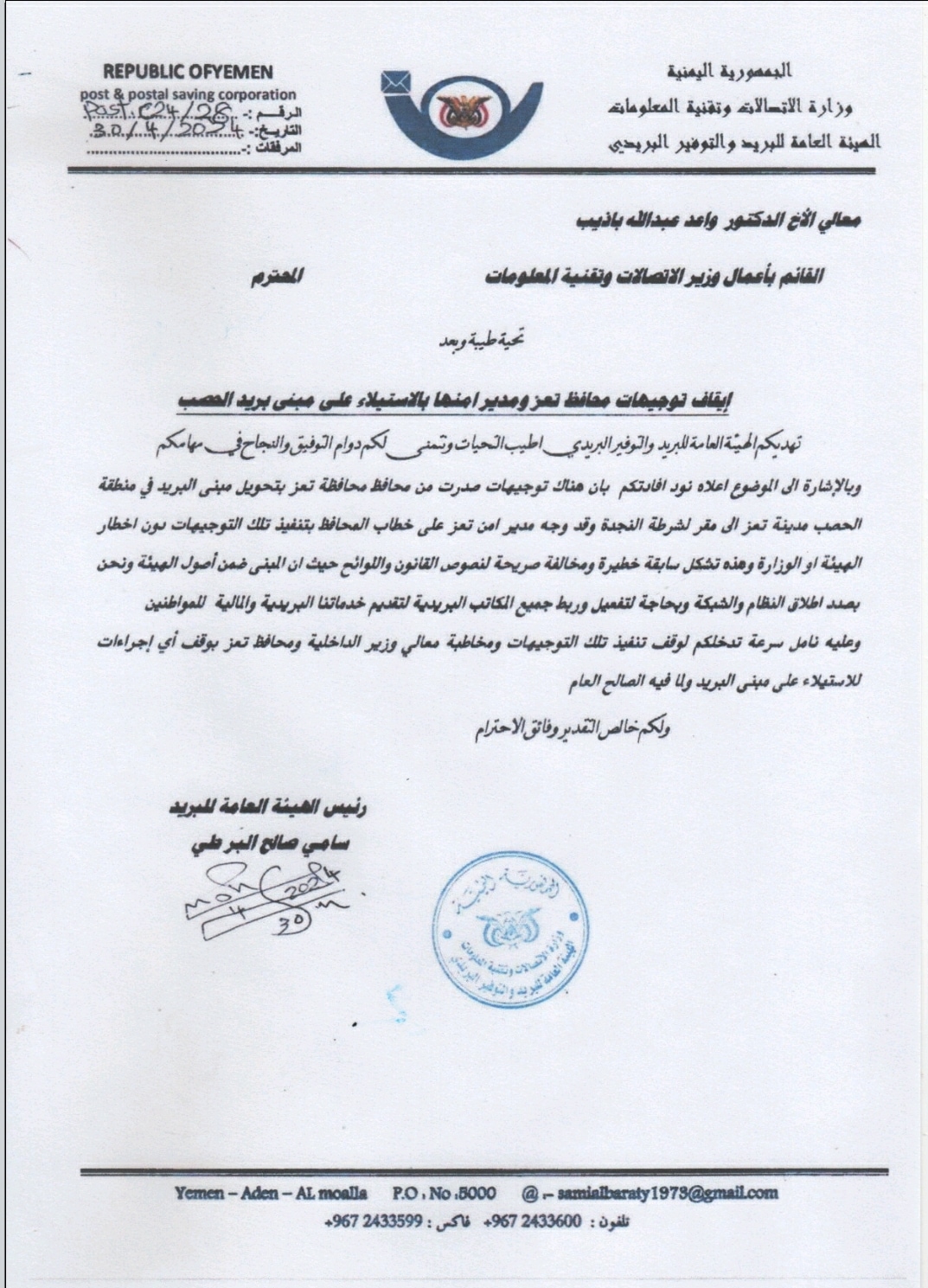 وقالت مصادر خاصة ل"يمان نيوز" أن هئية البريد رفعت مذكرتها الى وزير الاتصالات والذي بدوره وجه برفع الى وزاره الداخليه بمذكره آلا أن محافظ تعز رفض كل تلك الاومر..