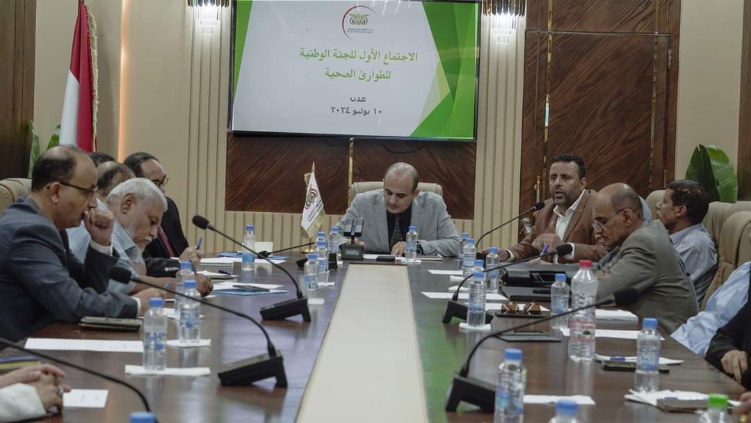 رأس وزير الصحة العامة والسكان رئيس اللجنة الوطنية للطوارئ الصحيةالدكتور قاسم محمد بحيبح بالعاصمة المؤقتة عدن اليوم الاجتماع الأول للجنة