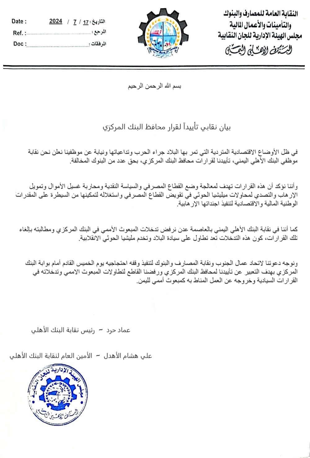 عدن ...نقابة البنك الأهلي تايد قرارات محافظ البنك المركزي وترفض تدخلات المبعوث الأممي