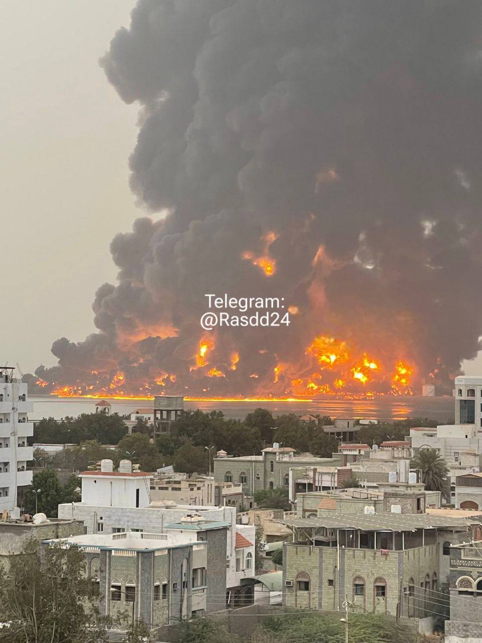 وبث ناشطون يمنيون مشاهد من الموقع المستهدف بالقصف الإسرائيلي في مدينة الحديدة، وتظهر المشاهد اشتعال حريق ضخم في موقع يعتقد أنه خزانات وقود في ميناء المدينة.