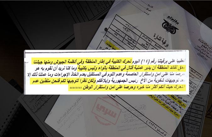 وحصلت الجزيرة على وثيقتين سريتين تؤكدان تدخلا مباشرا لوزير الدفاع اليمني اللواء محمد ناصر أحمد لمنع تحركات عسكرية ضد الحوثيين يرى القادة الميدانيون أنها كانت ضرورية.