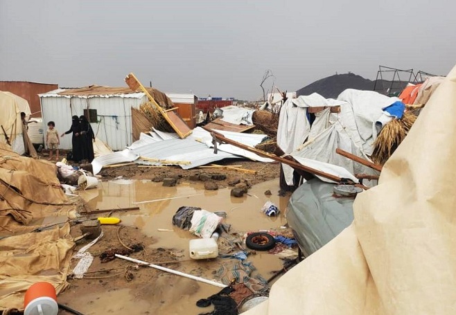 ولفت إلى أن الكارثة ضاعفت بشكل مباشر من معاناة الأسر النازحة في المخيمات وأدت إلى تلف كبير للمأوى الطارئ والمأوى المؤقت ومواد الإيواء والغذاء ولم تقتصر الأضرار على جانب المأوى بل تعدتها إلى انقطاع الخدمات الأساسية كالمياه والكهرباء والخدمات الصحية مما جعل من الوضع كارثة حقيقية تستوجب استنفار وحشد كافة الجهود لمعالجة ما خلفته من أضرار.