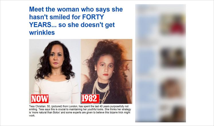 وتقول الصحيفة إن التجاعيد تحدث بسبب التغضن الناجم عن التبسم الدائم، وإن الخطوط التي تظهر على الجبين من انقباض عضلات الوجه تتسبب في انثناء الأنسجة الضامّة.