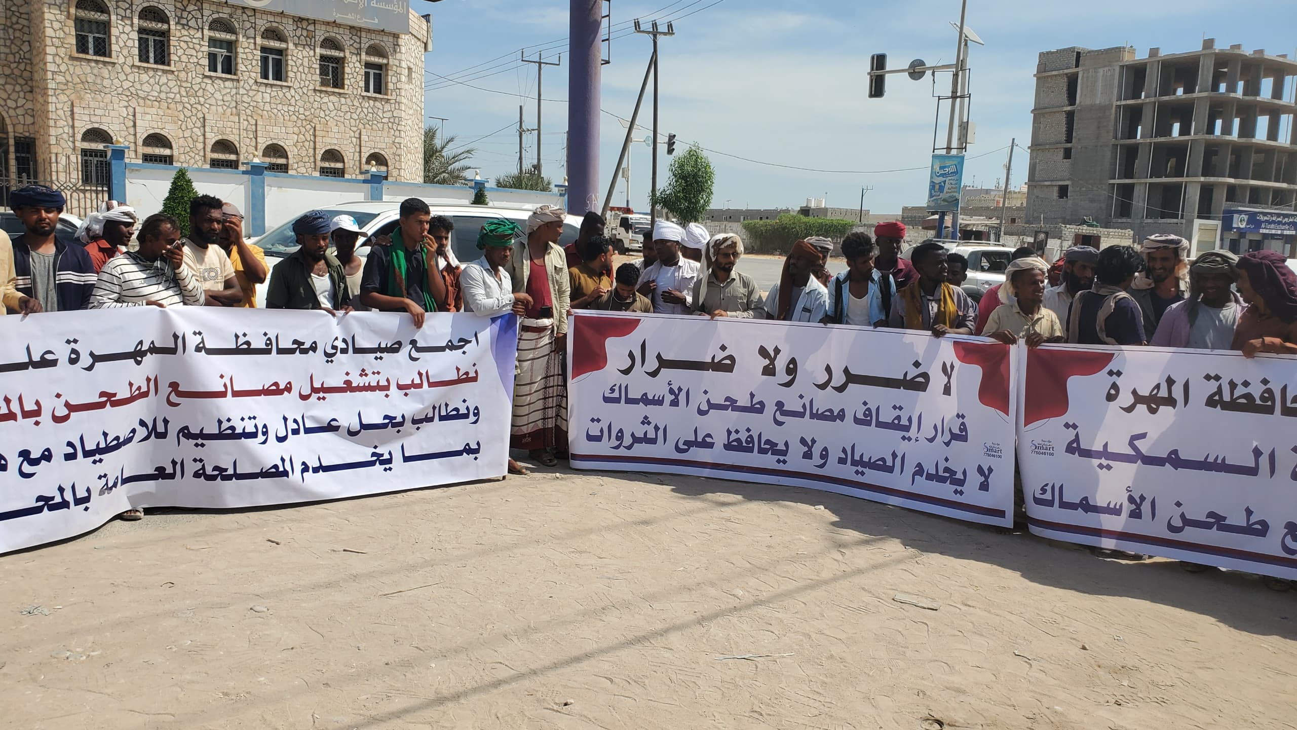 صيادو المهرة ينظمون وقفة احتجاجية للمطالبة بتشغيل مصانع طحن الأسماك وضمان حقوقهم