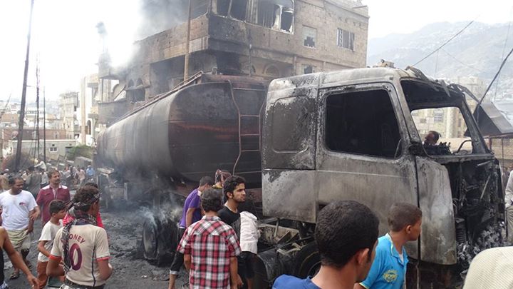 وقال سكان أن أكثر من 12 قتيلا بينهم 7 جثث متفحمة و 150 مصاب بسقطوا جراء انفجار ناقلة نفط في حي الضربة وسط مدينة تعز صباح اليوم كما تضرر 3 منازل وعشرات السيارات.