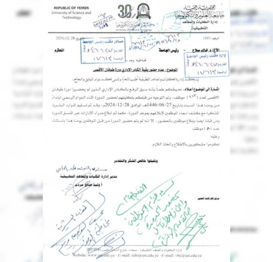 كشفت مراسلات داخلية، بين الإدارة المعينة من الحوثيين لإدارة جامعة العلوم والتكنولوجيا، عن عزوف ورفض موظفي الجامعة وكادرها الإداري حضور دورات طائفية، رغم التهديدات المتكررة.