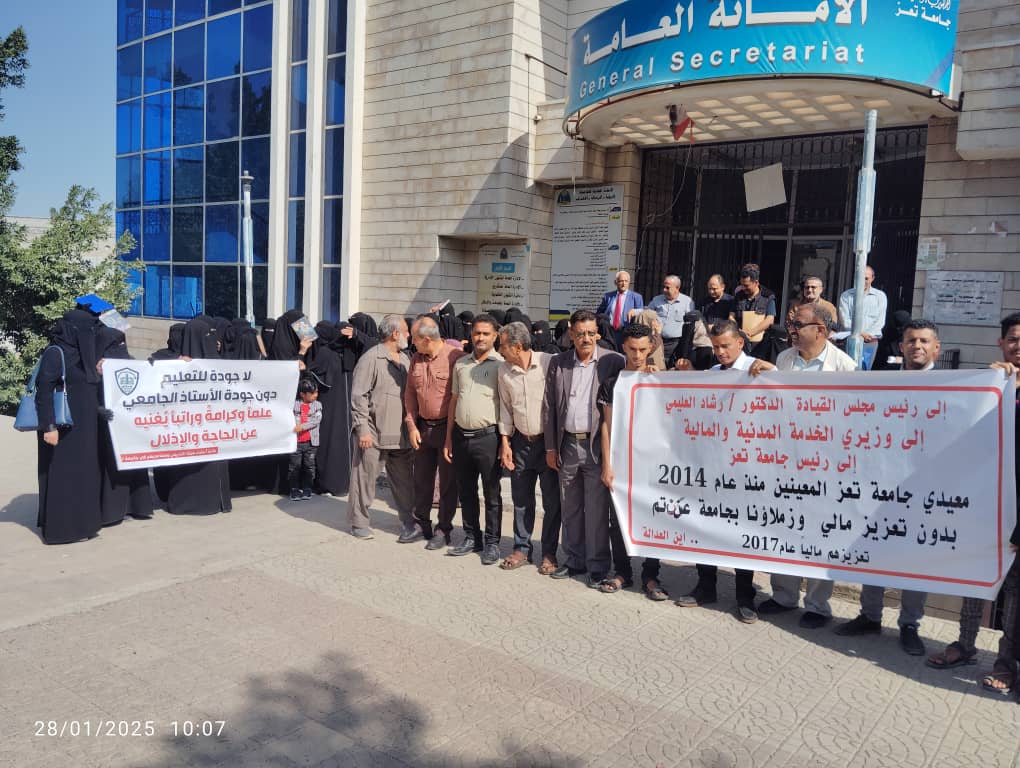 نظم أعضاء هيئة التدريس بجامعة تعز اليوم مسيرة احتجاجية للمطالبة بتسوية مرتباتهم بما يتناسب مع الارتفاع المستمر في تكاليف المعيشة، وصرف العلاوات السنوية المتأخرة، إضافة إلى توفير بدل سكن وتأمين صحي شامل واعتماد التعزيز المالي للمعيدين المعينين اداريا ولم يتم تسوية اوضاعهم المالية.