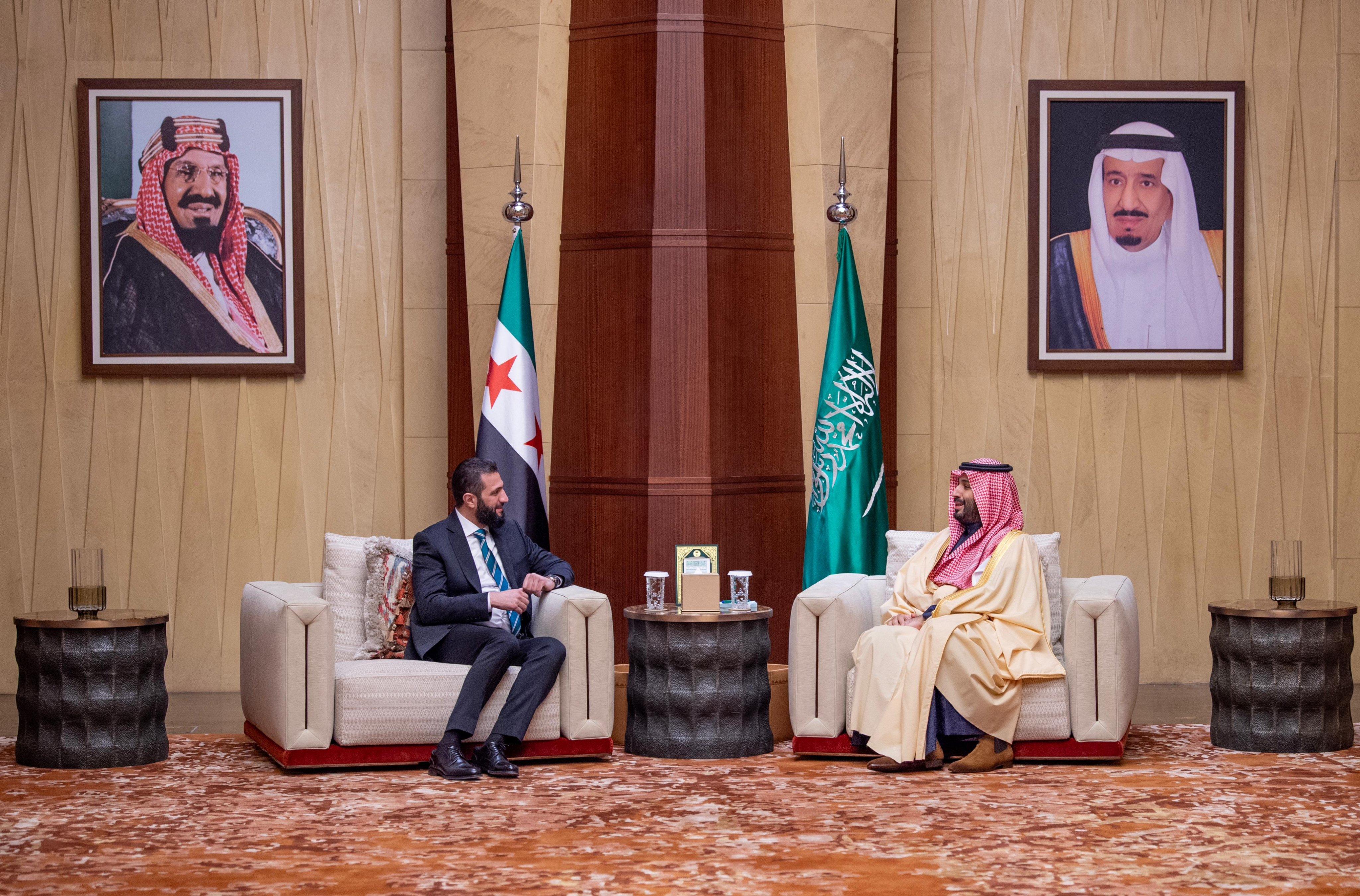 وقالت وكالة "واس" السعودية، إنه في "بداية الاستقبال، عبّر ولي العهد عن التهنئة لأحمد الشرع بمناسبة توليه رئاسة الجمهورية العربية السورية، متمنيًا له التوفيق والسداد في تحقيق آمال وطموحات الشعب السوري الشقيق".