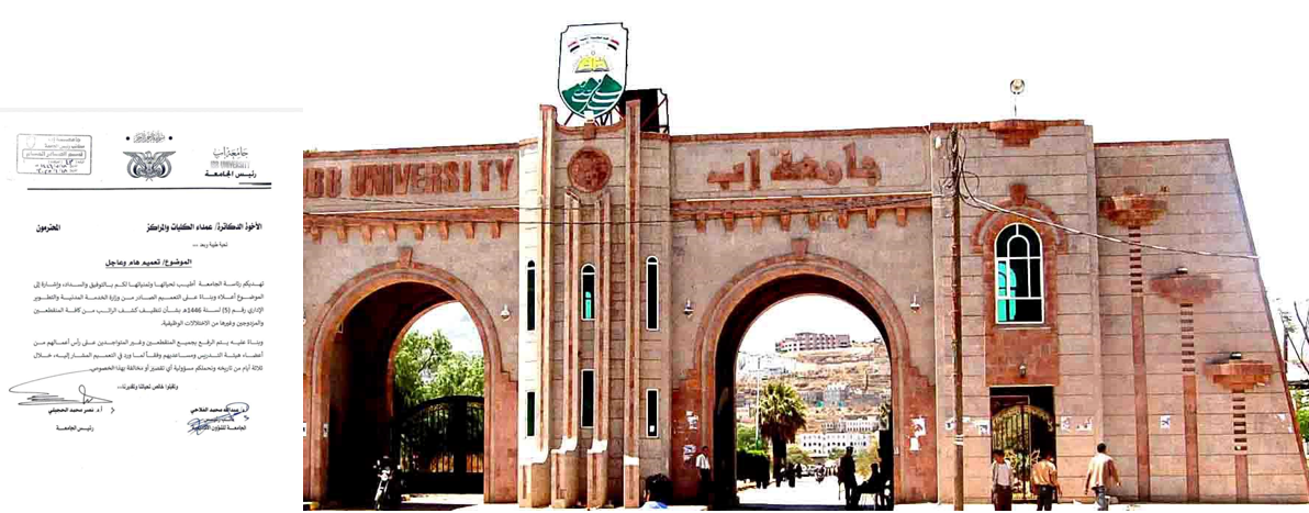 وقالت مصادر أكاديمية إن رئيس جامعة إب وجه برفع كافة الأكاديميين وأعضاء هيئة التدريس وموظفي الجامعة الذين تركوا أعمالهم في الجامعة، خلال السنوات الماضية نتيجة تعرضهم للملاحقة والمطاردة والاختطافات من قبل مليشيا الحوثي.