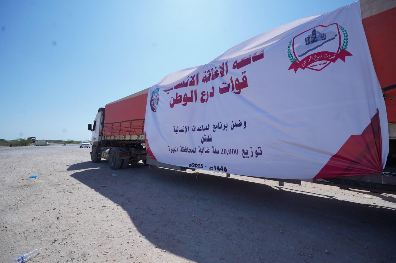 وقامت قوات درع الوطن باستلام هذه القافلة من المساعدات، لتتولى توزيعها في مناطق انتشارها بمحافظة المهرة، وذلك ضمن الجهود الرامية إلى التخفيف من معاناة السكان وتحسين الظروف المعيشية في ظل الأوضاع الإنسانية الصعبة.