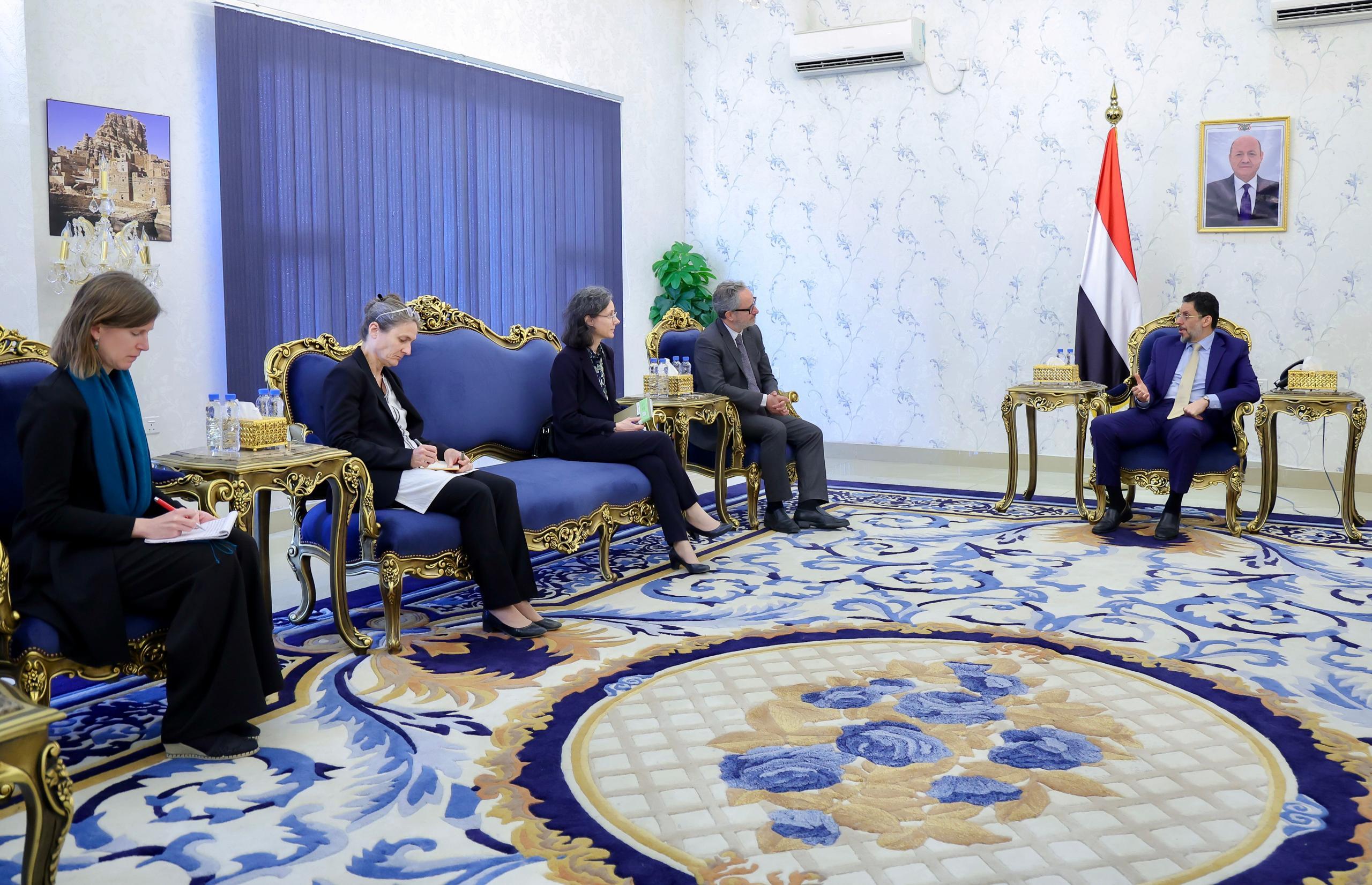 وتطرق اللقاء إلى بدء إجراءات سريان القرار الأمريكي بإعادة تصنيف مليشيا الحوثي كمنظمة إرهابية أجنبية، والتدابير الحكومية المتخذة لعدم تأثر العمل الإنساني والمواطنين بهذا القرار.