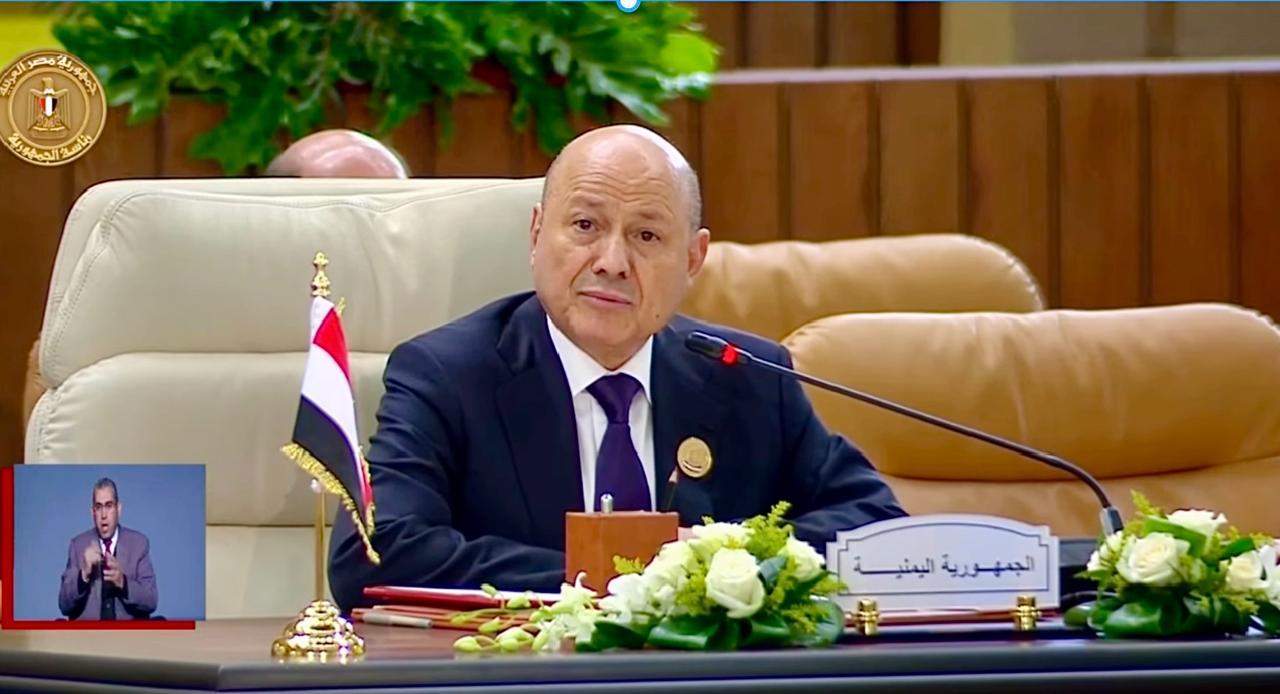 وفي كلمته أمام القمة العربية غير العادية المنعقدة في القاهرة، الثلاثاء، شدد العليمي على أن أي مقاربة سياسية لتحقيق استقرار شامل ومستدام مرهونة بإنهاء النفوذ الإيراني الذي يزعزع الأمن والسلم الدوليين.