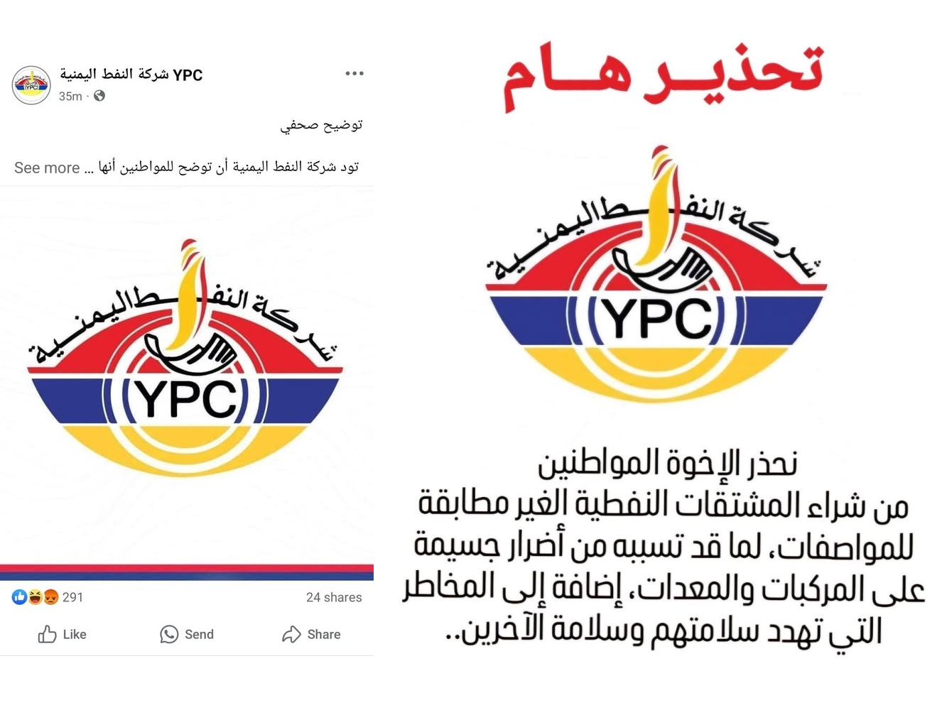 وفي تعميم تداوله نشطاء حذرت الشركة "من شراء المشتقات النفطية الغير مطابقة للمواصفات، لما قد تسببه من أضرار جسيمة على المركبات والمعدات، إضافة إلى المخاطر التي تهدد سلامتهم وسلامة الآخرين".
