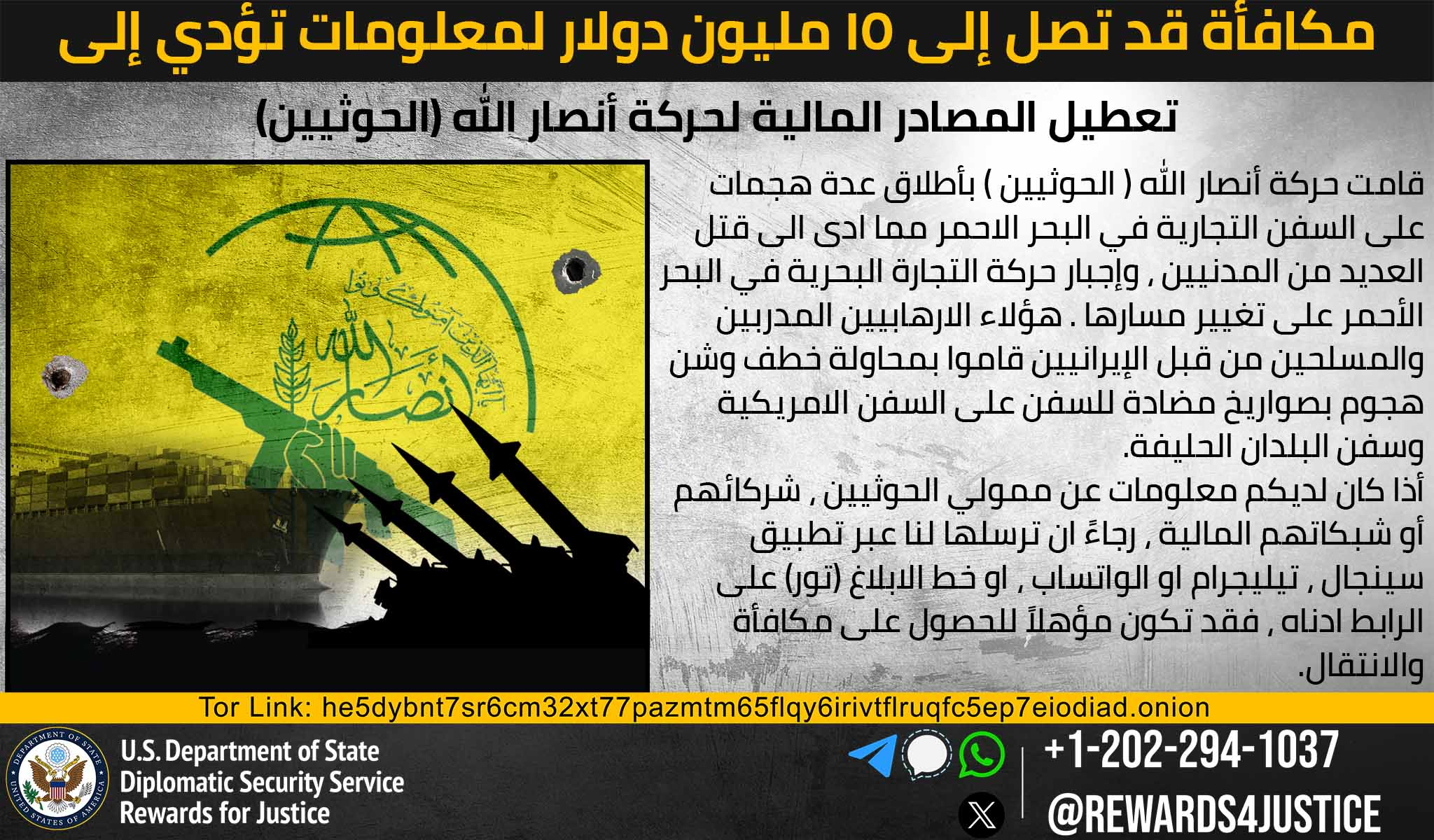 أعلن برنامج "مكافآت من أجل العدالة" التابع لوزارة الخارجية الأمريكية، يوم الثلاثاء، عن مكافأة مالية تصل إلى 15 مليون دولار مقابل معلومات تؤدي إلى تعطيل الشبكات المالية التابعة لميليشيا الحوثي المدعومة من إيران.