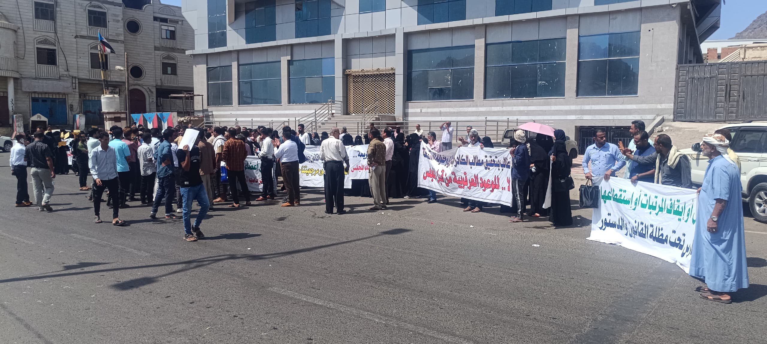 نظم قضاة وإداريون من منتسبي السلطة القضائية، صباح اليوم الأحد، وقفة احتجاجية سلمية أمام بوابة قصر المعاشيق في العاصمة المؤقتة عدن، للمطالبة باعتماد وتوفير الموازنة الكافية لتمكين مؤسسات القضاء من أداء مهامها بكفاءة وحياد، وفق ما ينص عليه الدستور والقوانين والمواثيق الدولية.