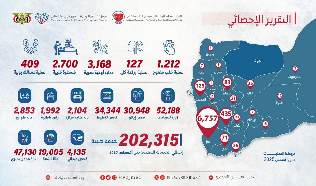 وأفاد التقرير الإحصائي الصادر عنهما أن الفرق الطبية والجراحية تمكنت خلال هذه الفترة من إجراء 1,212 عملية قلب مفتوح لمرضى من مختلف الأعمار، إضافة إلى 127 عملية زراعة كلى، وهو ما يعد نقلة نوعية في مستوى الخدمات الطبية التخصصية بالمحافظة واليمن، التي تفتقر لمراكز مشابهة.