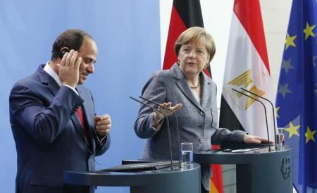 وكانت ميركل تتحدث في مؤتمر صحفي مشترك مع الرئيس المصري الزائر عبد الفتاح السيسي رددت محتجة في نهايته هتافا وصفت فيه السيسي بأنه "قاتل".