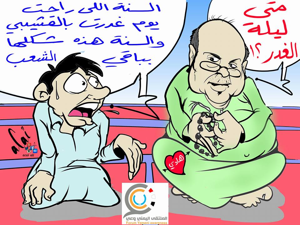 تداول ناشطون على مواقع التواصل الاجتماعي كاريكاتير حمل عنوان " ليلة الغدر" في اشارة الى تخاذل وعجز الرئيس هادي في قضايا الشعب اليمني وكان اهما تصفية الشهيد حميد القشيبي في رمضان من العام الماضي.