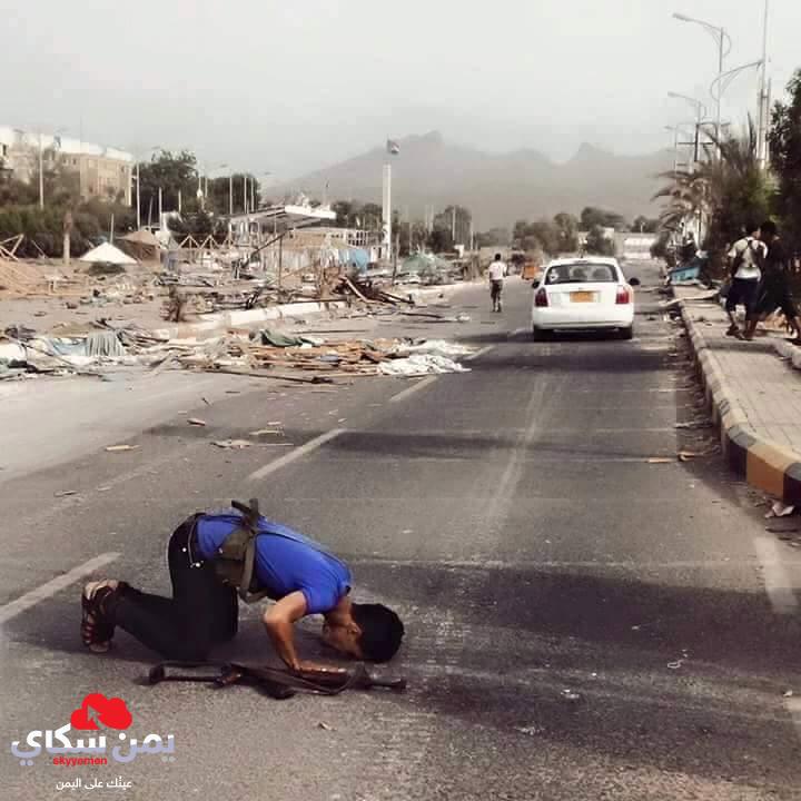 تداول ناشطون على مواقع التواصل الاجتماعي في اليمن صورة لاحد افراد المقاومة الشعبية وهو ساجد سجود الشكر في احد شوارع عدن التي تم تحريرها اليوم.