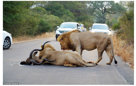التقطت المصورة البريطانية الهاوية كارولين دانفورد ( 23 عاما) صوراً دموية تحبس الأنفاس في حديقة كروجر الوطنية في جنوب أفريقيا، بعدما ظهر أسدين جائعين لمحاصرة ظبي الكودو. وخاطر بعض السياح بالتفرج مباشرة من خلال النوافذ المفتوحة، بينما انهمك الأسدين في تمزيق فريستهما.