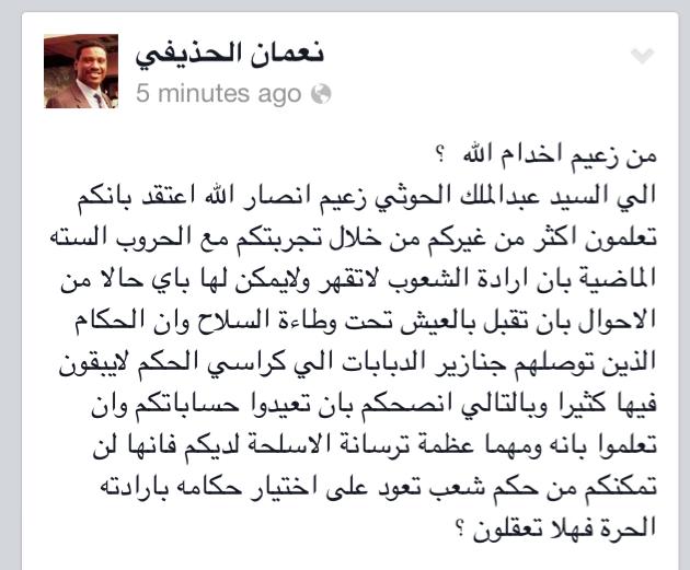 وجه نعمان الحذيفي ممثل فئة المهمشين بمؤتمر الحوار الوطني رسالة شديد اللهجة الى عبدالملك الحوثي.