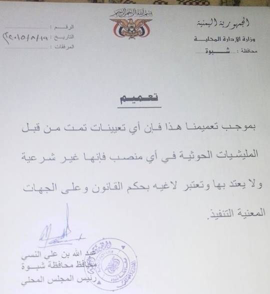 اصدر محافظ شبوة المعين مؤخرا من قبل الرئيس عبدربه منصور هادي، اصدر تعميما بالغاء كافة القرارات بالمحافظة التي صدرت باشراف الحوثيين او بتوجيهاتهم.