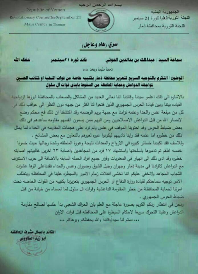 طالب مشرف ميليشيات الحوثي بمحافظة ذمار، من زعيم الجماعة عبدالملك الحوثي، بتعزيزه بكتيبة من قوات النخبة التابعة للحوثيين لمواجهة من اسماهم بالدواعش وحماية المحافظة من السقوط.