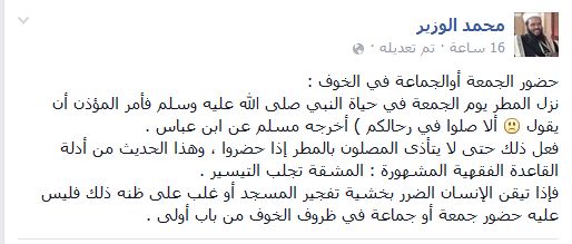 واستدل بحادثة نزول المطر في أحد ايام الجمعة في حياة النبي صلى الله عليه وسلم فأمر المؤذن أن يقول للناس الا صلوا في رحالكم، مضيفا أنه فعل ذلك حتى لا يتأذى المصلون بالمطر إذا حضروا ، وهذا الحديث من أدلة القاعدة الفقهية المشهورة : المشقة تجلب التيسير.