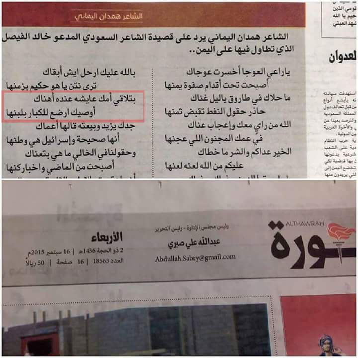 حيث نشرت الصحيفة على صفحتها الاخيرة في عددها الصادر اليوم الأربعاء 16 سبتمبر 2015 ابيات شعرية لشاعر يدعى “همدان اليماني” يرد فيها على شاعر سعودي يدعى خالد الفيصل ، قالت الصحيفة أنه تطاول على اليمن.