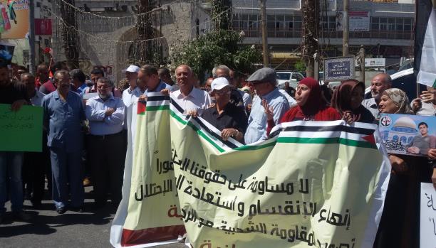 ورفع المشاركون لافتات تطالب بضرورة وحدة الشعب الفلسطيني وفصائله، خلال فعالية جابت شوارع مدينة رام الله، وسط الضفة الغربية، احتجاجاً على ما يجري في الأقصى من انتهاكات إسرائيلية، وإحياءً للذكرى السنوية لمجزرة صبرا وشاتيلا، وتضامنًا مع الأسرى الفلسطينيين المضربين عن الطعام.