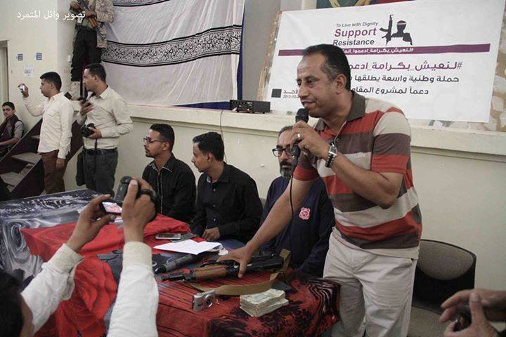 عرض الشيخ حمود المخلافي قائد المقاومة الشعبية في تعز سلاحه الشخصي "الكلاشنكوف، اليوم الأحد، في مزاد علني، دعما للمقاومة.