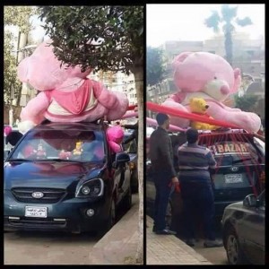 تفاجيء مارة أحد شوارع محافظة الدقهلية بسيارة تحمل على سقفها أكبر هدية لعيد الحب، وكانت عبارة عن دبدوب كبير بمبي اللون، الحجم هو ما أثار انتباه البعض، والبعض الآخر أثاره خرق الشاب المحب للون الأحمر التقليدي، واختياره للون مختلف، وهو اللون البمبي، وأخريات وقفن وبعيونهم نظرة الغبطة على الفتاة التي تذهب لها أكبر هدية لعيد الحب هذا العام، وبادرن بالتقاط الصور للهدية.