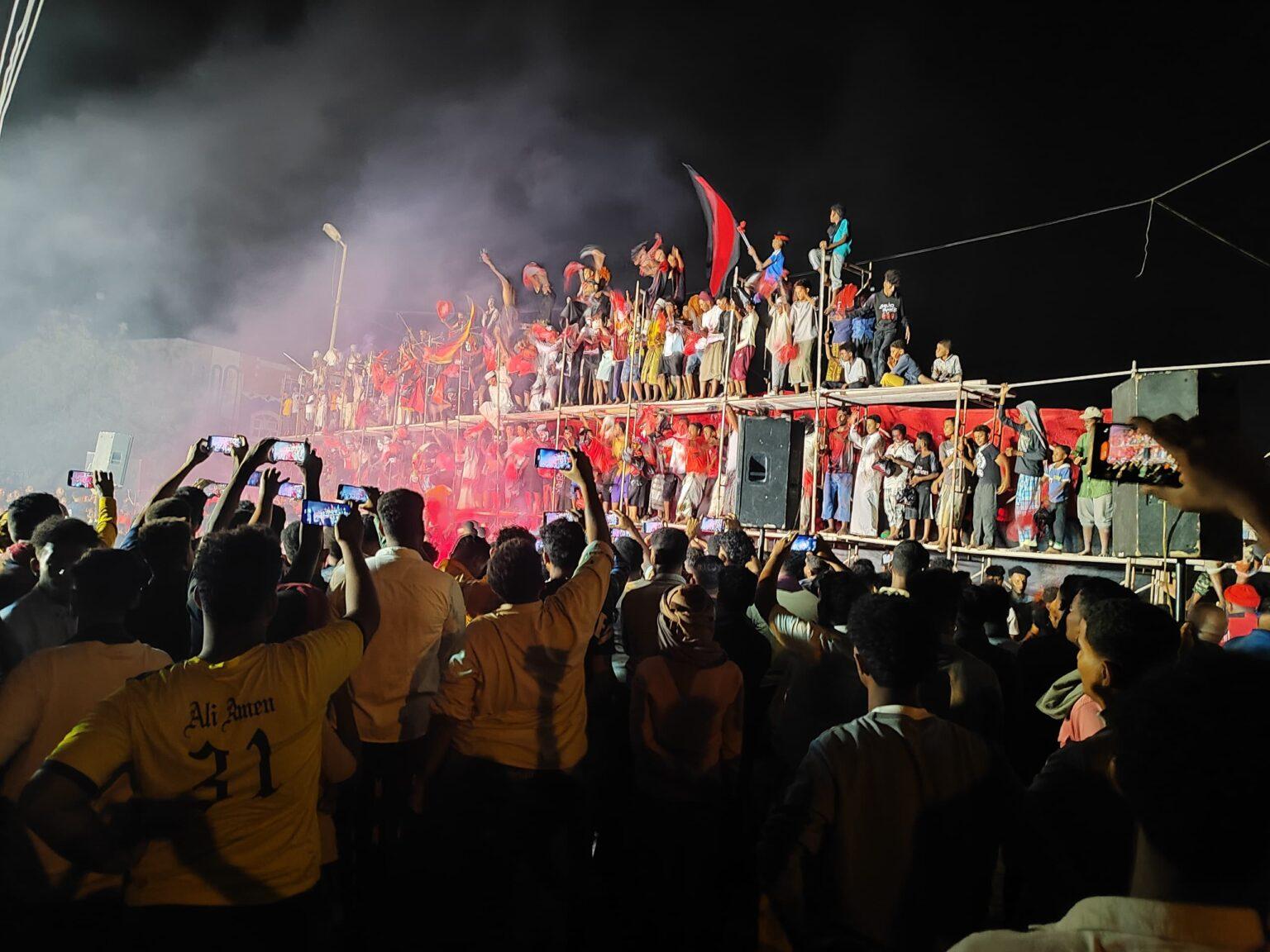وأظهر مقطع فيديو تداوله ناشطون على وسائل التواصل الاجتماعي انهيار إحدى السقالات التي كان يرقص عليها مشجعو نادي التعاون الرياضي بساحة الخور قبل أن يسقطوا على مشجعين آخرين.
