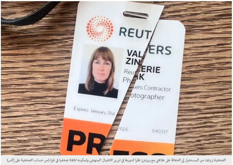 أعلنت المصورة الصحفية الكندية فاليريا زينك استقالتها من العمل مع وكالة رويترز للأنباء، احتجاجا على دور الوكالة في تعزيز دعاية إسرائيل وتبني مبرراتها بقتل الصحفيين الفلسطينيين في قطاع غزة، وفق منشور للصحفية عبر حسابها الخاص على موقع إكس (تويتر سابقا).
