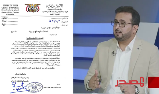 قدّم رئيس الهيئة العامة للأراضي والمساحة والتخطيط العمراني، سالم ثابت العولقي، استقالته رسميًا إلى رئيس الوزراء الدكتور سالم صالح بن بريك، احتجاجًا على ما وصفه بـ"التدخلات وعرقلة مسار الإصلاحات المؤسسية والقانونية" داخل الهيئة.